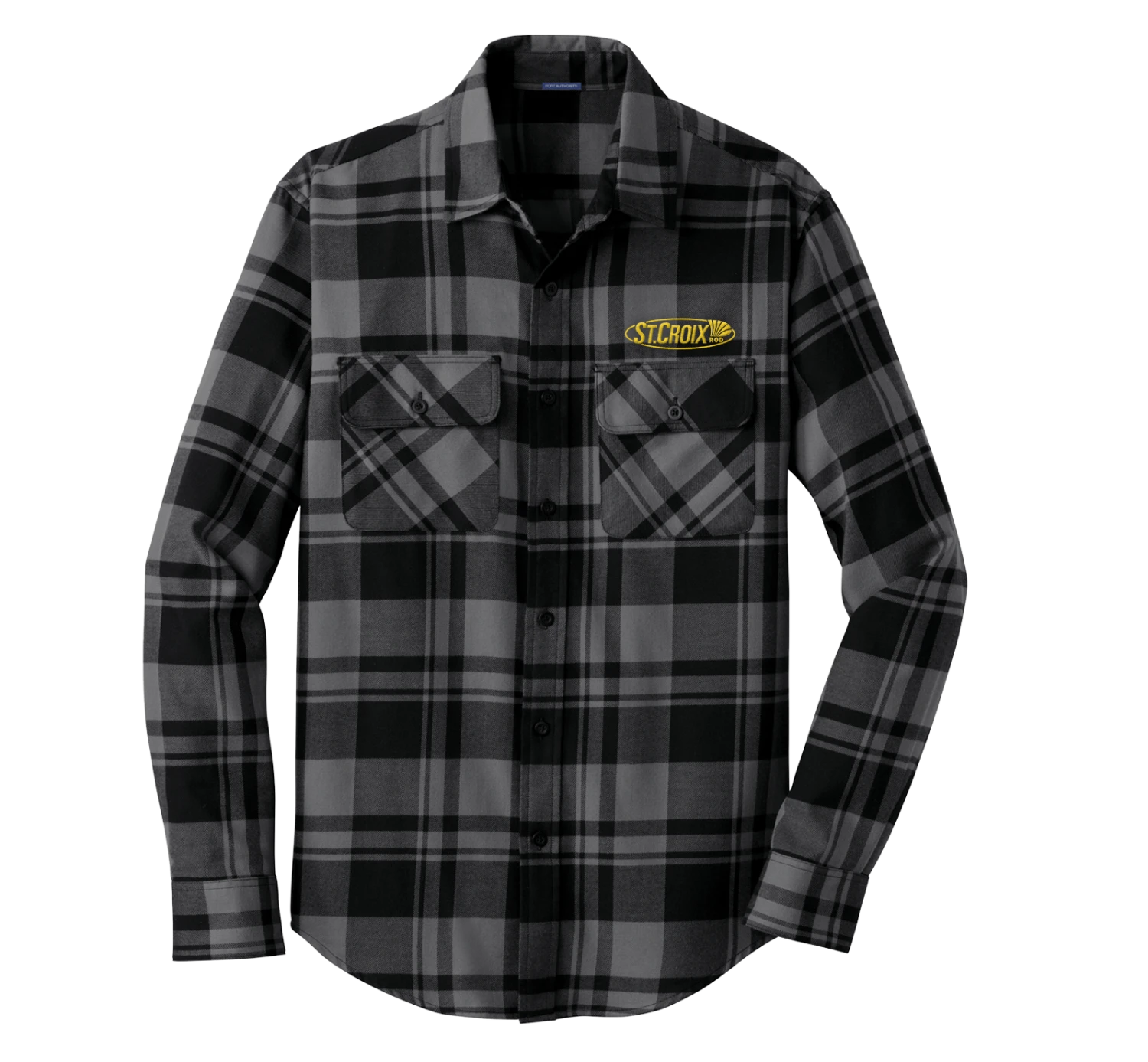 Stay warm and look good on those chilly mornings and nights out on the water in this gray and black embroidered flannel value-up! Made of 60% cotton/40%polyester.