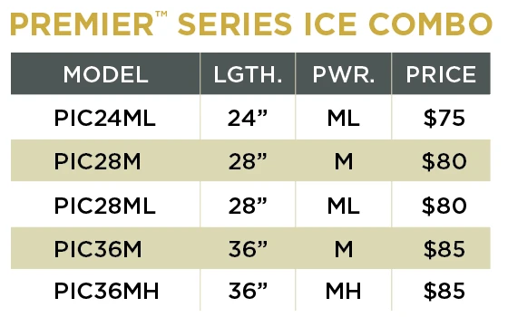 A completely new offering in 2020 is the Premier Ice Combo. The reliable Premier Ice rod is back and paired with aĀ PIC 500 reel featuring ABS spool and folding arm, soft touch handle knob, and special grease for cold temps. This combo is sure to bring you success on the ice.