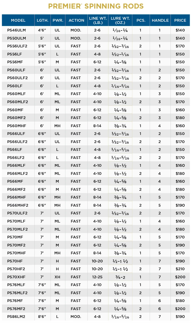 With a rare combination of high performance and value, it’s no secret why the Premier® series has been the most popular U.S.-built rod for decades. Available in 38 spinning models, there is a rod for every freshwater species out there.