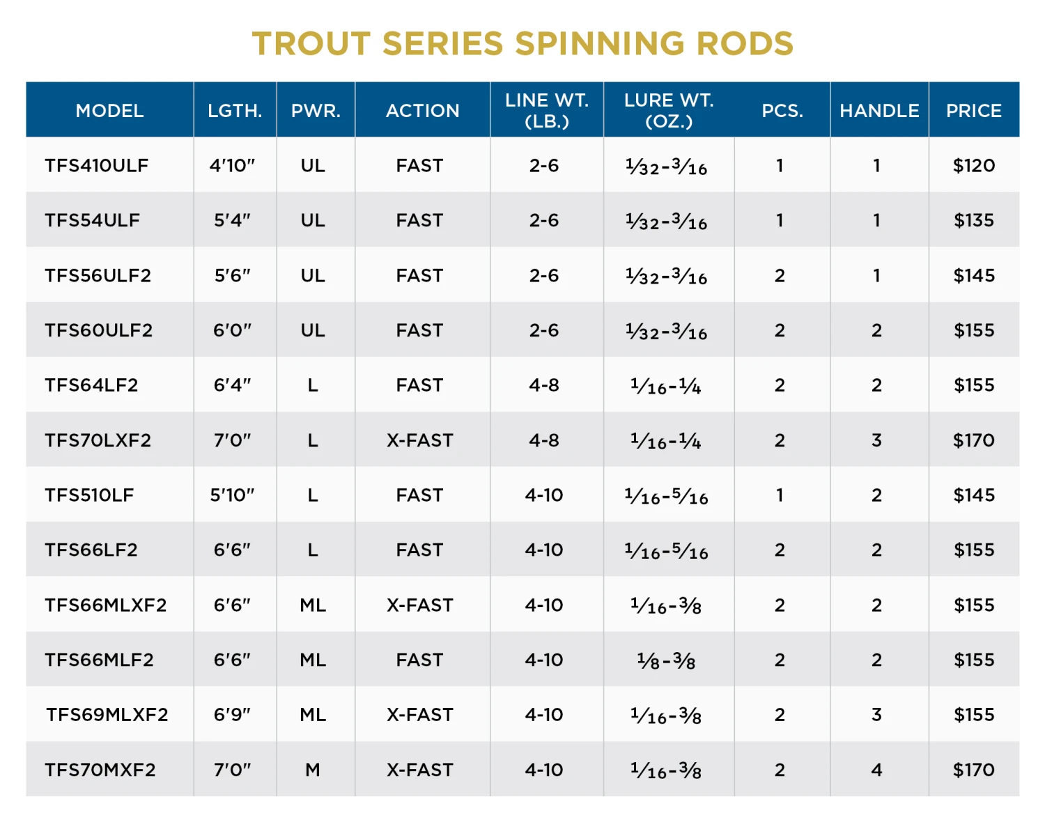 Trout specific spinning rods built for durability. Slim profile split grip handle configurations decrease weight while perfecting balance. Trout Series brings an array of lengths, powers, and specific actions to anglers looking for sensitivity, controlled performance and casting accuracy casting light lures.